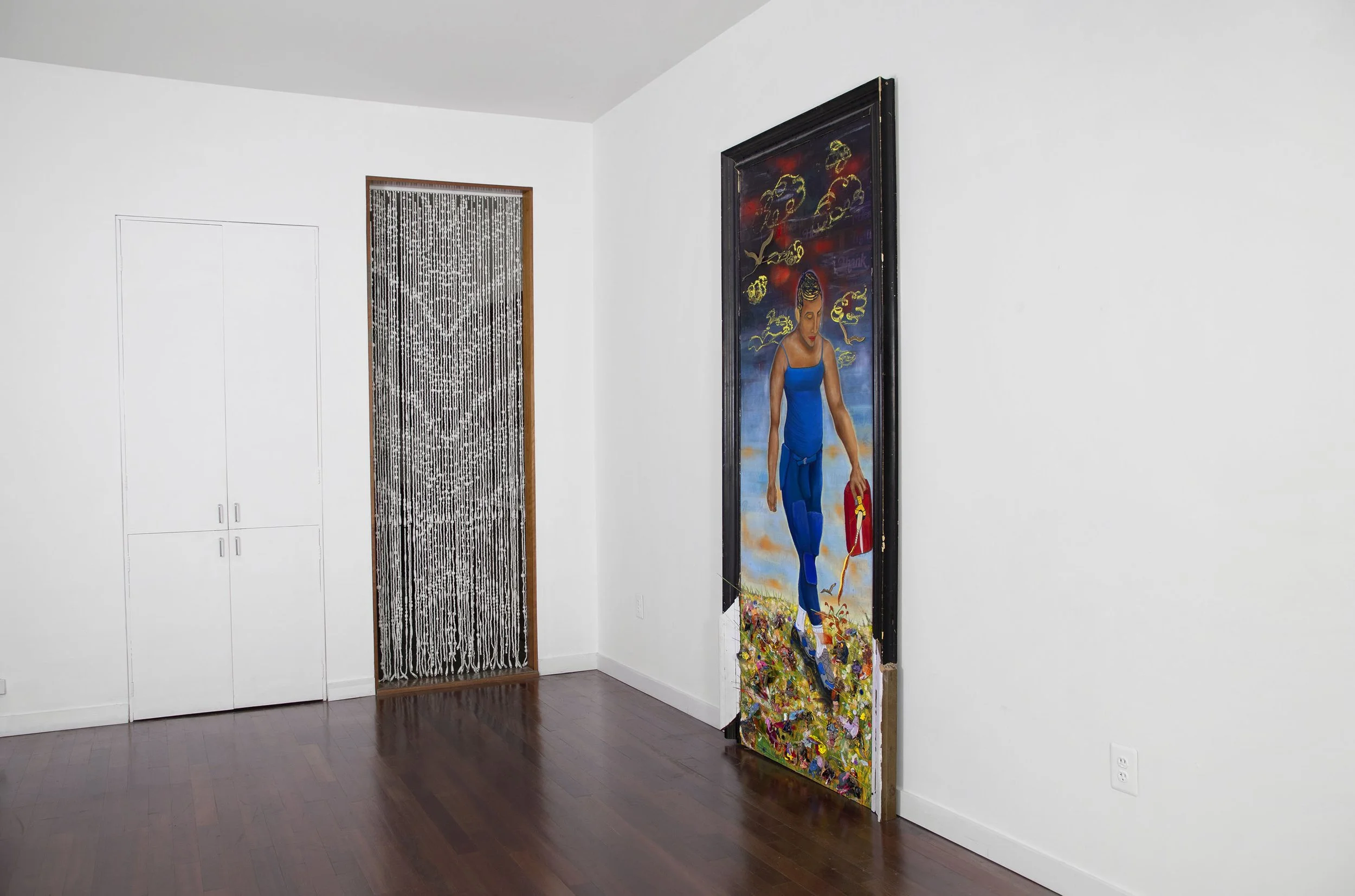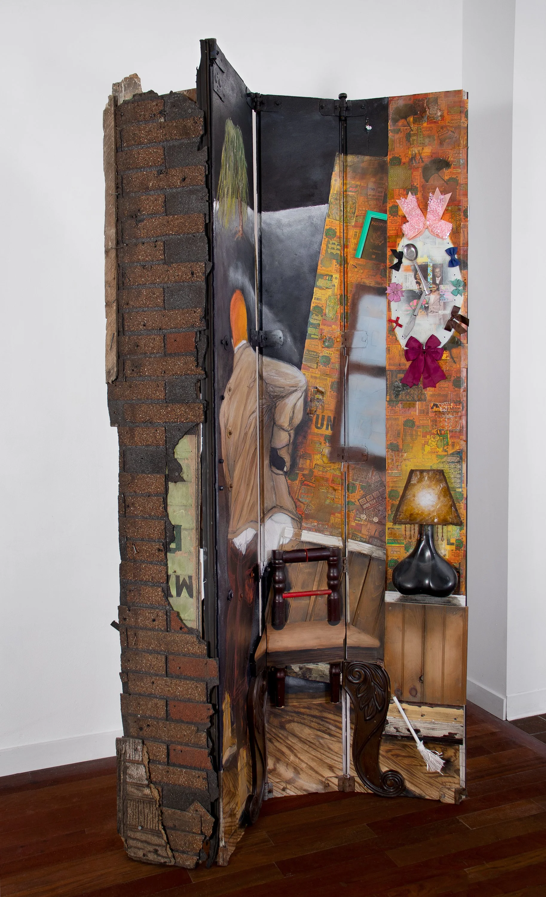 Oil pastel, wood veneer, charcoal, acrylic, house paint, oil, NY Yankees hat, Maria D's, felt, color pencil, Federal Hill, Harlem, takeout cups, advertising poster, "One Way" vinyl sticker, pencil shavings, cashed matches, spray paint, paint skins, collage, graphite, yarn, lemongrass, screen door, cabinet door, toys, Haint Blue on canvas