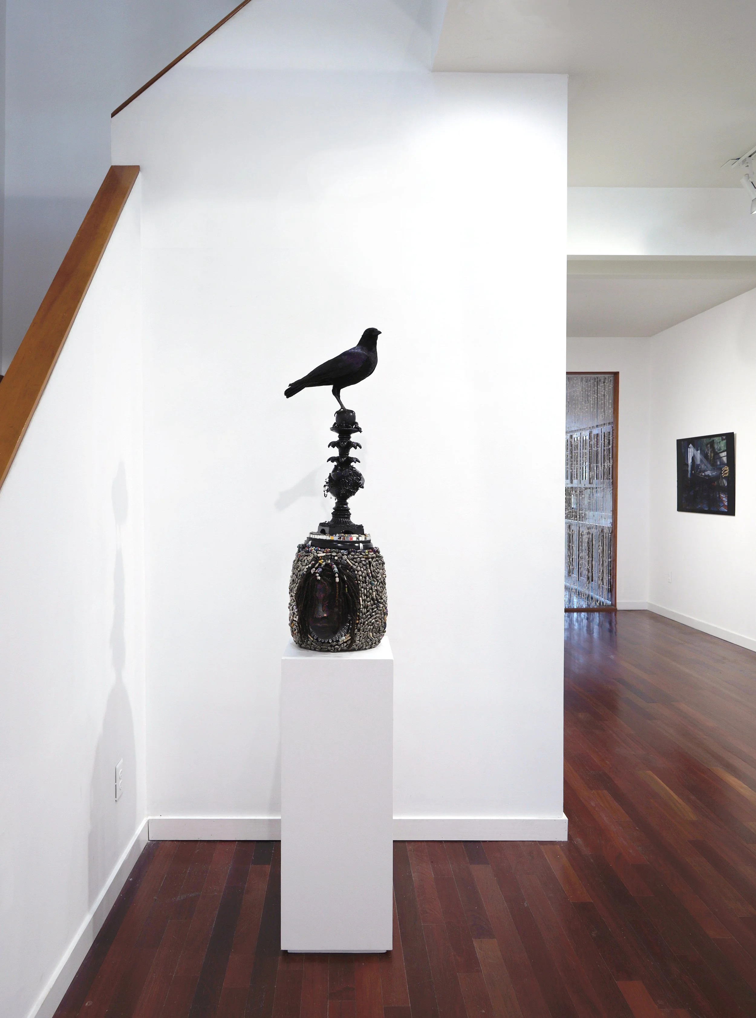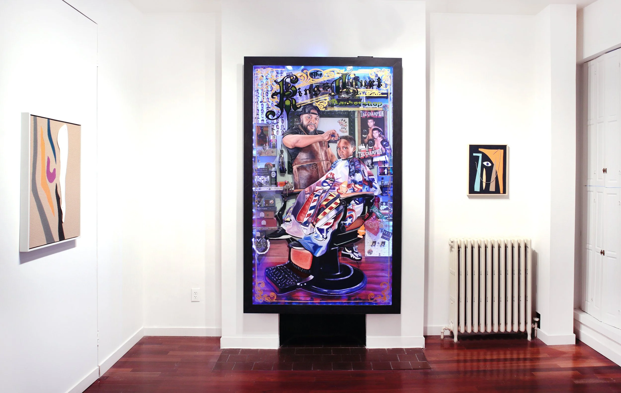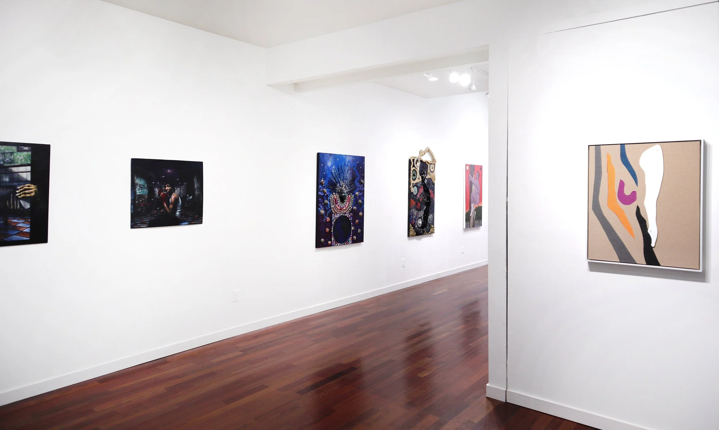The exhibited works focus on the figure: abstracted body parts constructed from yoga mats; anthropomorphic paintings of trees and flowers that allude to human sexuality; densely detailed paintings of African deities; depictions of spirit animals; surrealist self portraits and romantic portraits of loved ones; tintypes using 19th century photographic technology to capture the likeness of city residents; and a photorealistic painting of a local barbershop that incorporates found objects, sound, and lighting elements that relate to the cultural activity in that space.